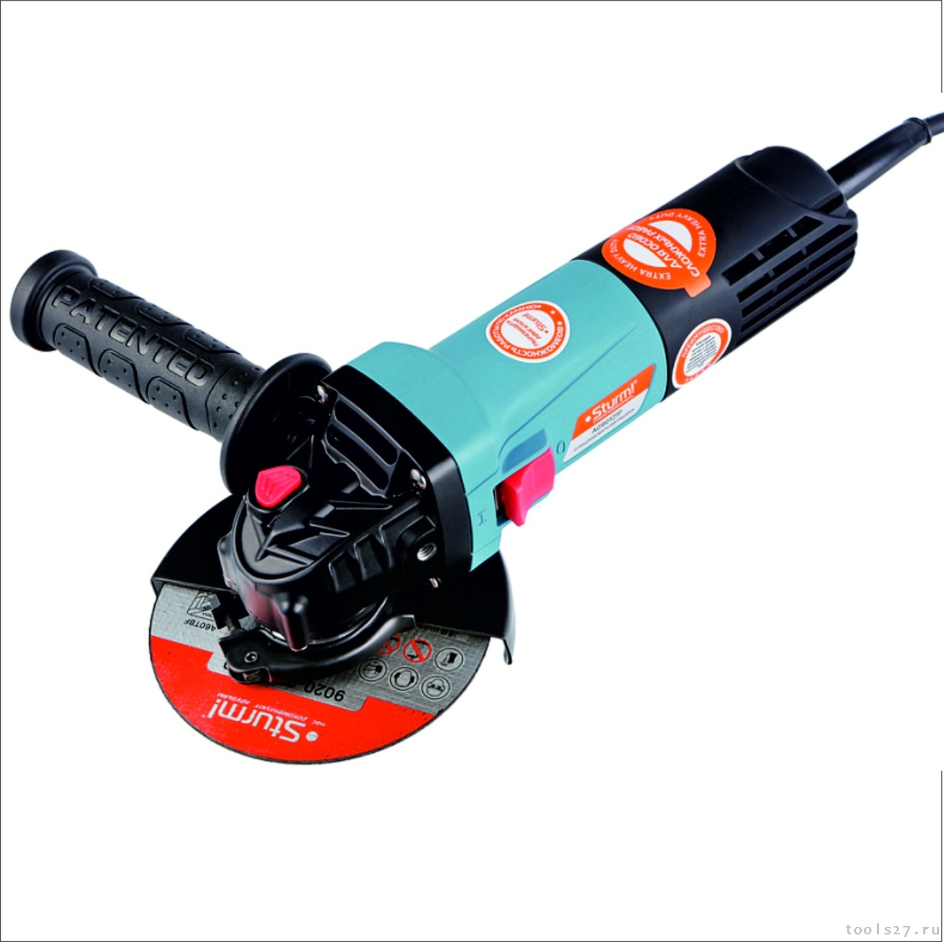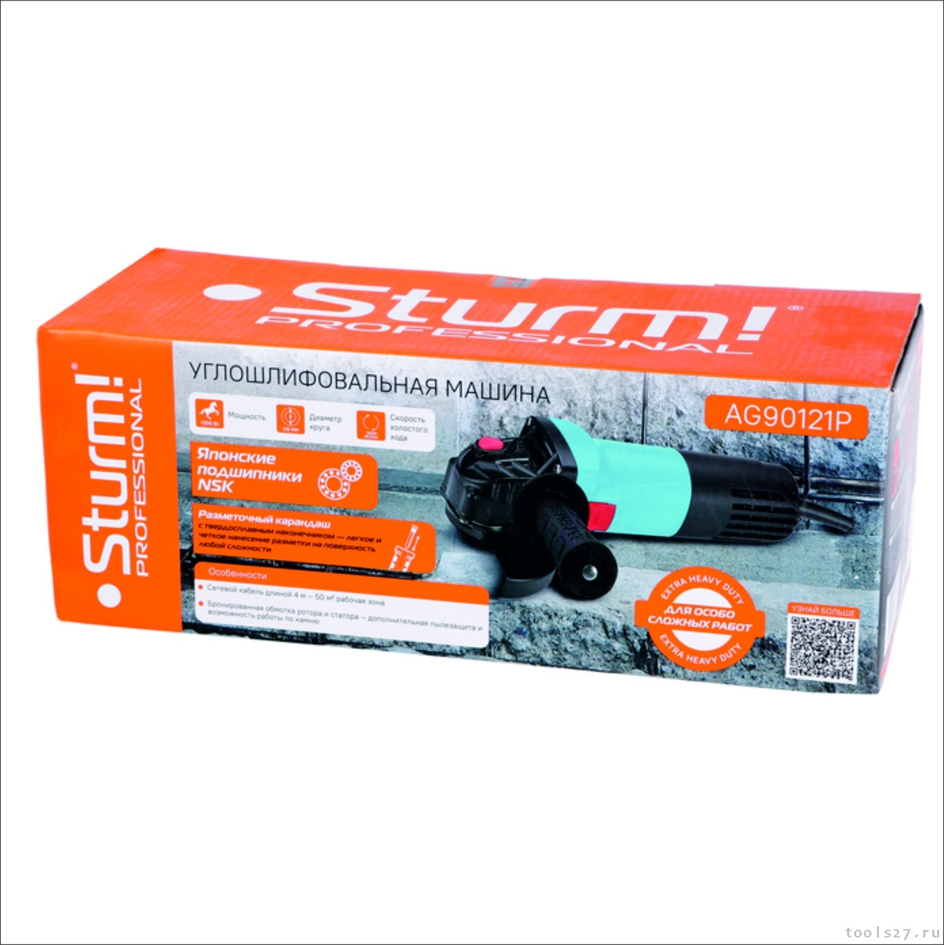 Sturm AG90121P – мощная универсальная болгарка (УШМ) профессиональной серии инструмента Sturm под рабочий диаметр диска 125 мм. Модель обладает оптимальными массово-габаритными показателями и выверенными пропорциями: малый диаметр корпуса обеспечивает максимальное удобство хвата, нейтральный центр тяжести позволяет уверенно контролировать инструмент в процессе работы даже одной рукой, низкопрофильный корпус редуктора клиновидной формы облегчает работу в местах с трудным доступом. Инструмент оснащен мощным 1200 ваттным электромотором, рассчитанным на длительную непрерывную работу и имеет дополнительную защиту от пыли и абразивных частиц (двухстороннее бронирование ротора армирующей нитью, залитые компаундом обмотки статора), что дает возможность уверенно использовать инструмент не только при операциях с металлом, но и при работах с камнем или керамической плиткой. Надежность также гарантируют усиленный редуктор с закаленными шестернями и применение японских шарикоподшипников NSK. Корпус болгарки изготовлен с использованием нейлона, что способствует его долговечности. Для удобства пользователя модель снабжена быстросъемным защитным кожухом, который надежно фиксируется при помощи специального зажимного рычага – при необходимости можно быстро менять положение кожуха, не прибегая к помощи вспомогательного инструмента